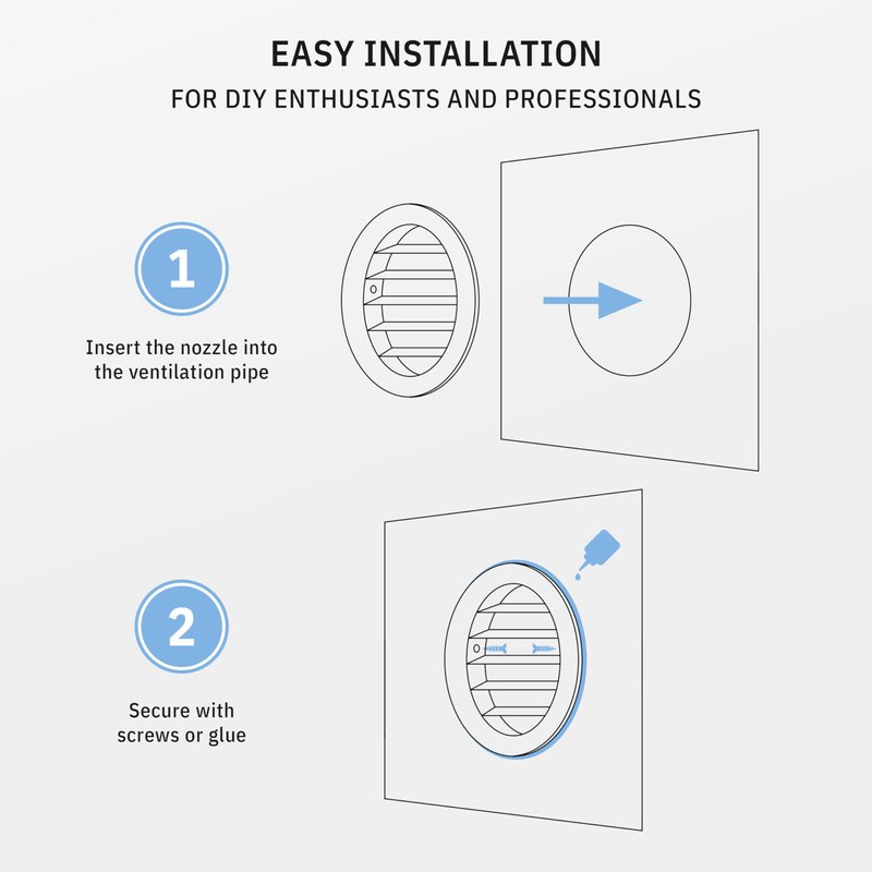 - 👍 EASY INSTALLATION The installation is not complicated, and easy to understand. You may mount this vent cover by using glue or by screwing it into the ventilation pipe. There are pre-bored holes, screws not included, for easy mounting.