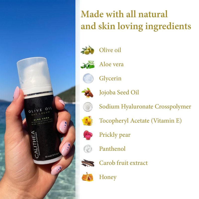 - Nourish your skin naturally: Formulated with organic olive oil, honey, carob, aloe vera, and clinically-proven hydrating ingredients, our day cream works to regenerate and maintain your skin's natural moisture levels, leaving it supple, radiant, and healthy-looking.