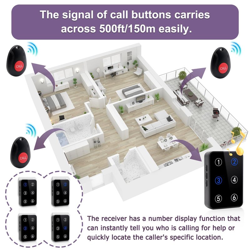- [POWERFUL CAREGIVER CALLING SYSTEM] This call button has strong wireless signal penetration, whether you are indoors or outdoors, you can quickly receive emergency messages. The emergency buttons for elderly are also less susceptible to spurious radio frequencies and do not disrupt sleep. Allows freedom for caregivers and residents while ensuring help is available at the touch of a button, ideal for the elderly, elderly, sick, and disabled.