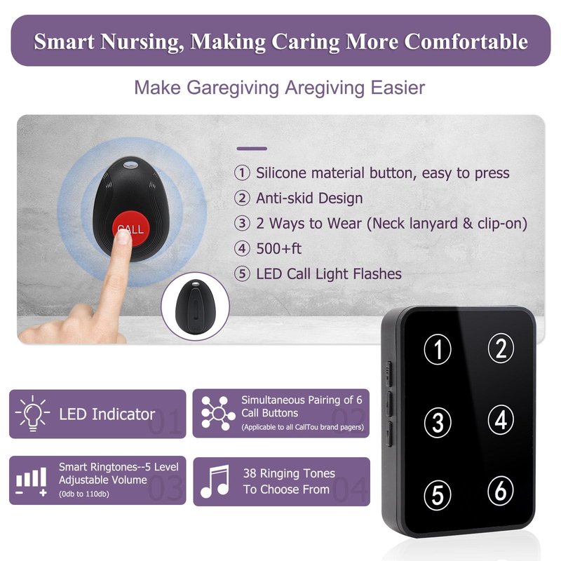 - [WHAT YOU GET] 2 Receiver (Each receiver can correspond to 6 call buttons), 6 Call Button, Operating Instructions, 12 months no reason to return and exchange service and CallToU’s friendly customer service. CallTou wireless caregiver pager setup is simple and you can easily add more call buttons or receivers.