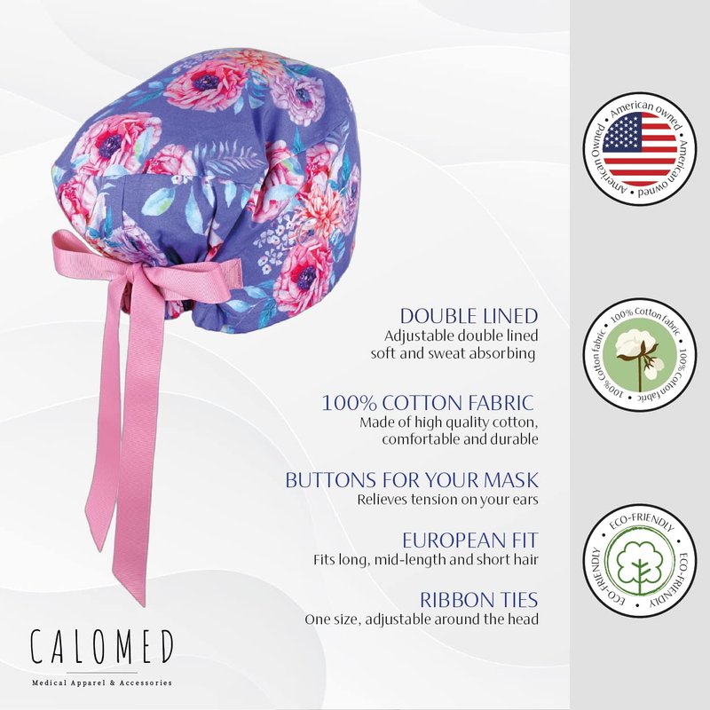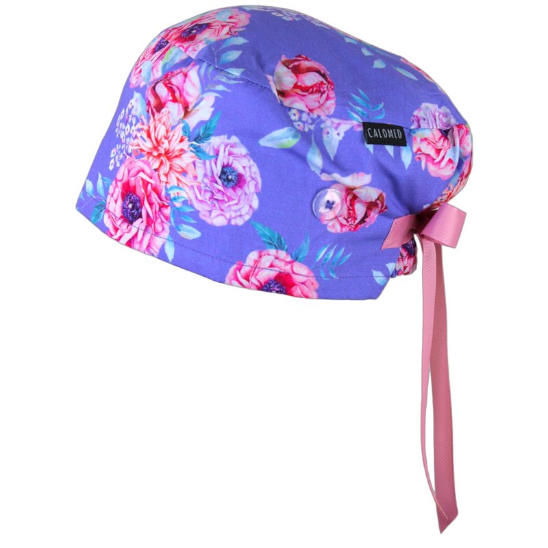 CALOMED Scrub Cap for Women and Men, Euro Style Scrub Caps, Working Hat, Head Cover with Ribbon Ties and Buttons, Long or Short Hair (Pink Peonies)