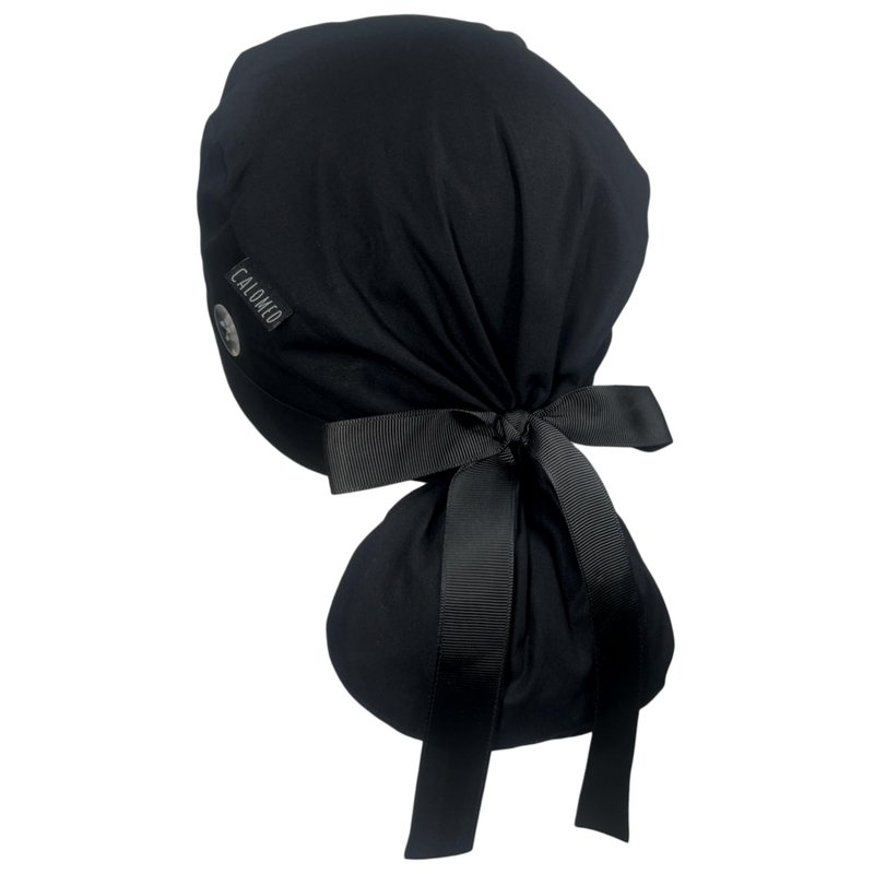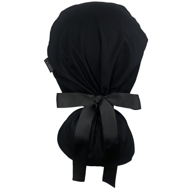CALOMED Scrub Cap for Women and Men, Ponytail Scrub Caps, Working Hat, Head Cover with Ribbon Ties and Buttons, Long Hair (Plain Black)