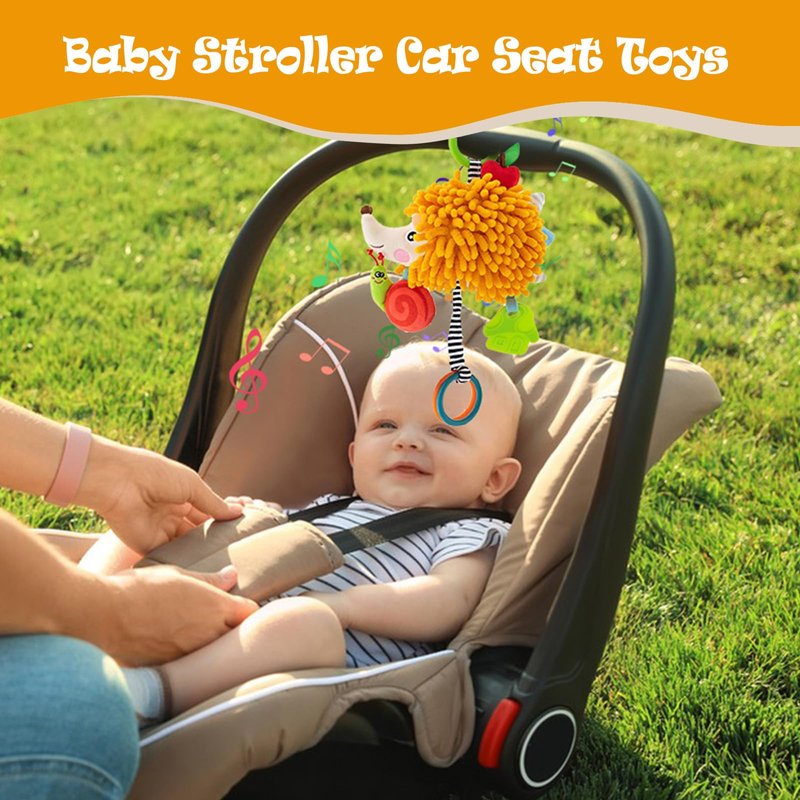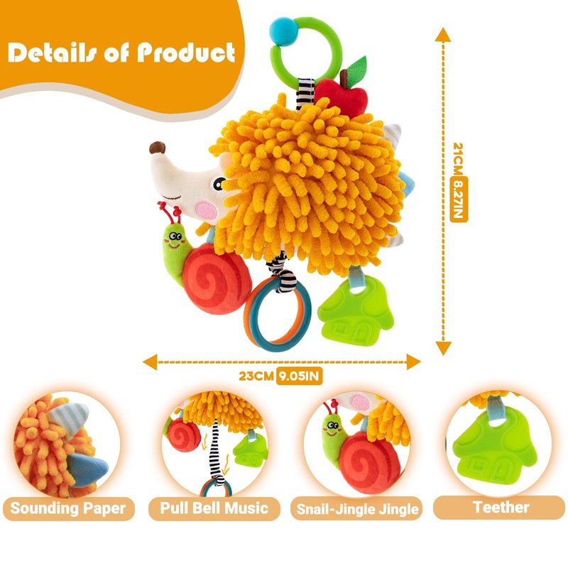 - Developmental Toys:Car seat toys for babies 0-6 months boy featuring an adorable design in the shape of a hedgehog animal as well as pull bells, baby teething toy and a BB device hanging baby toys to arouse curiosity and help babies learn and grow.