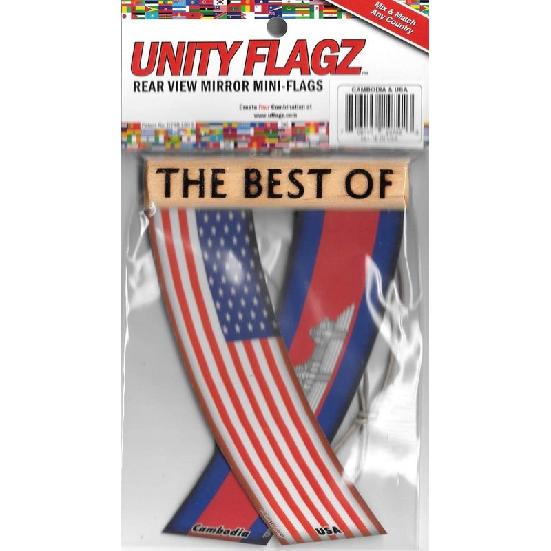 Cambodia and USA Rear view mirror mini hanging banner flags for the car Unity Flagz Unity Flagz are small handmade hanging ornaments that consists of two, three and up to four country flags united. Symbolizing unity between them, held by a crafted small piece of wood with the letters 'THE BEST OF' burned into it representing a person or a couples Best of Both Worlds. Made and assembled in USA. Uflagz offers an endless variety of flag combinations, mixing up to four countries in one flag. Giving you an opportunity to truly represent where you’re from, as well as representing you and loved ones in one unique flag. The materials used for our flags are industrial grade hard card stock, UV ink, protected with and industrial grade thick UV coated plastic lamination adding an extra layer of protection, extending the life and colors of this product 10x more than the original fabric square mini banners, united by two pieces of wood with the letters THE BEST OF burned into them and HEMP string as the cord used to hang the flags. Giving the Unity Flagz a handmade natural look! Build your own custom Unity Flagz combinations. Category: unity flags, united flags, the best of both worlds, the best of, flags of the world, united countries, car flags, v flag, two country flags, double flags, both worlds, rear view mirror flags, mini banner, crossed flags, flags for the car, mixed flags, pride flags, represent, diverse flags, diversity flags, world flags, country flags, nation flags, nationality flags, European flags, middle east flags, American flags, Asian flags, hanging flags, cool flags, uflagz, our worlds together flags, worldwide flags, best of both worlds flags, pride, my mixed flag, my mixed flags, flags coming together, union flags, international flags, flags of all countries, national flags, rear view mirror mini banners, representing, all country flags, flags mixed, design flags, flag combiner, make a flag, flags, flags of countries, united states flags, flags mix