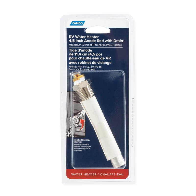 - Anode Type: 4 ½-inch long, 5/8-inch OD magnesium anode; Thread Size: ½-inch NPT threads