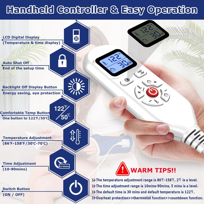 - 【AUTO SHUT-OFF & Use with Confidence】 Heated Wrist Wrap features 86℉-158℉ temp setting and 10-90min timer setting. AUTO SHUT-OFF at a pre-sett time, keeping you safe even if you drift off to sleep. Easily choose your own temperature and heating time to avoid overheating burns. CAMECO heating pad for wrist features an overheat protection, thermostat protection, and countdown function to provide permeating soothing heat and maintain a preset temperature. Universal size (Wrist size Up to 12 inches)