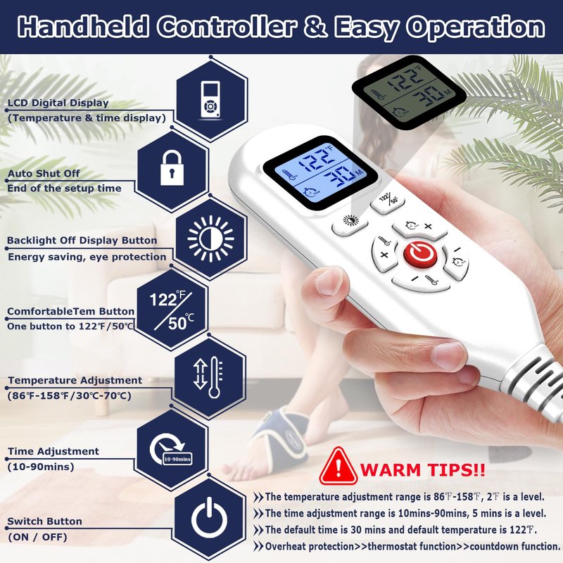 - 【Auto Off & Temperature Adjustable】The temperature is adjustable from 86℉ to 158℉, you can feel the heat within 5 seconds with advanced dense heating wire design. 10 - 90min time adjustable. Time is up, the heated wrap will auto shut off, which is very safe and energy saving. You can control temp and time easily to accommodate your comfort.