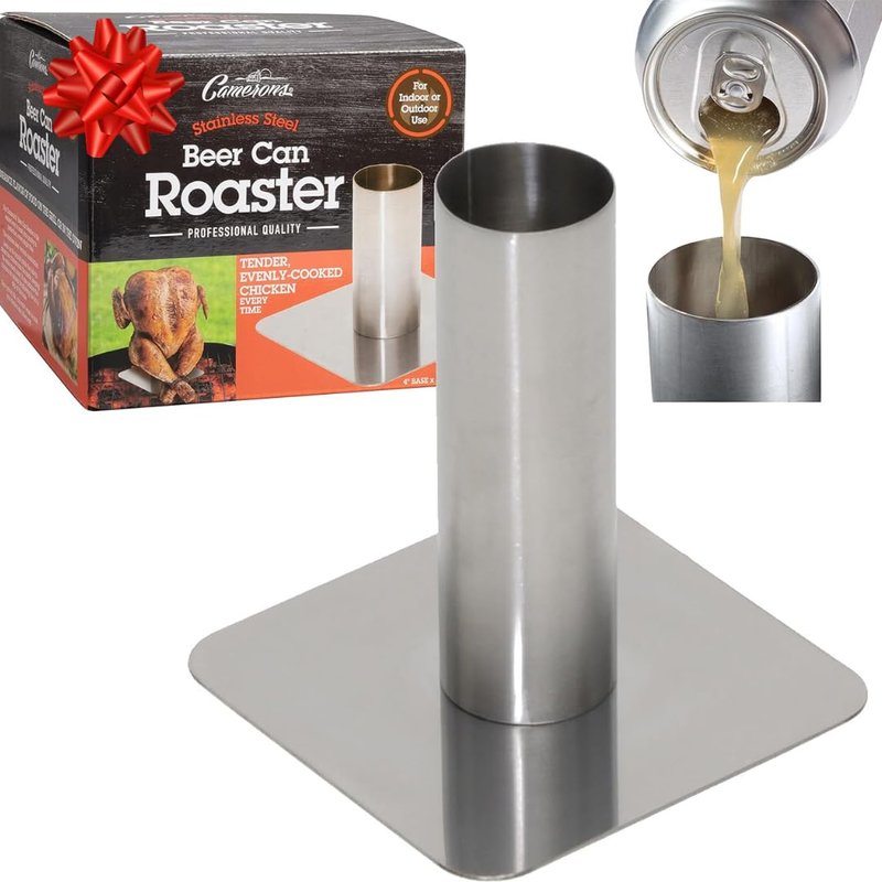- With the Camerons Stainless Steel Beer Can Roaster you can enjoy tasty chicken meals without the stress of having to use an actual aluminum beer can which contains inks that may rub off onto your food while cooking.