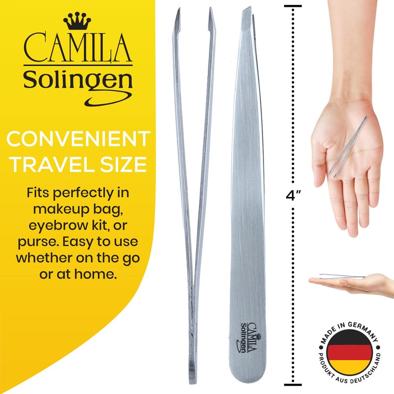 Camila Solingen Professional 4" CS25 Slanted Point Tweezers are Made of high quality Solingen, German stainless steel which assures a long lasting edge and eliminates the worry that the device will rust with ultra sharp surgical grade edges permitting a precise pull. Designed for a greater comfort and smoother action. A slim, sleek ergonomic design enhanced with a stunning chrome silver finish brings comfort and pleasure with each use. Camila Solingen is trusted globally by professional beauty technicians as well as home users. Durable and anti-corrosive tools.