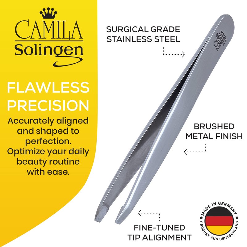 Camila Solingen CS25 4" Professional Surgical Grade Stainless Steel Precision Tip Eyebrow Tweezers for Facial Hair Shaping & Removal. Beauty Tool for Men/Women. Made in Solingen Germany (Slanted)