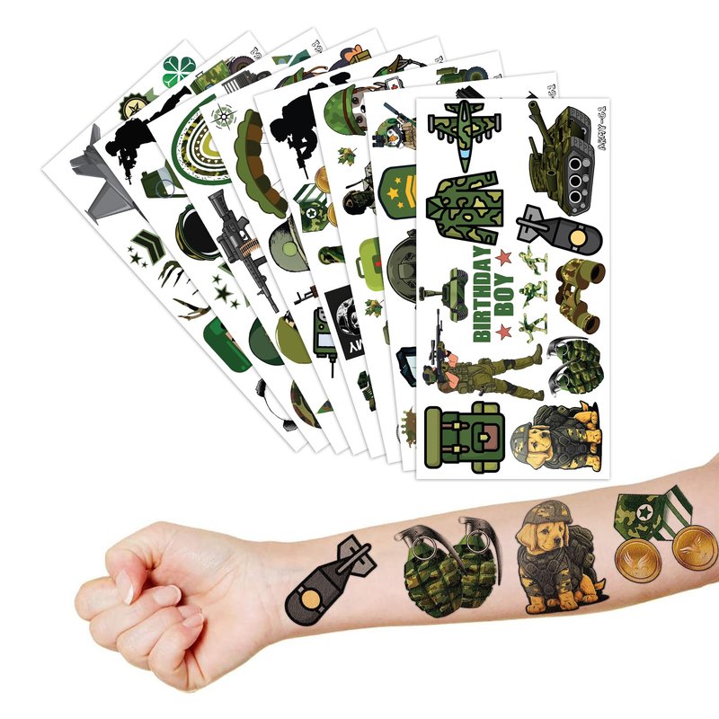 - 🎉【GREAT GIFT IDEAS FOR ARMY PARTY SUPPLIES DECORATION 】: Army temporary tattoos provide children with the experience of thrilling military missions. With these army tattoos from our shop, children can immerse themselves in the role of real warriors in a virtual fighting scene, complete with guns, bullets, and military equipment. During the party, children will have no boredom at all, replaced with cheer and excitement as they play with our captivating tattoos. One size fits kids.
