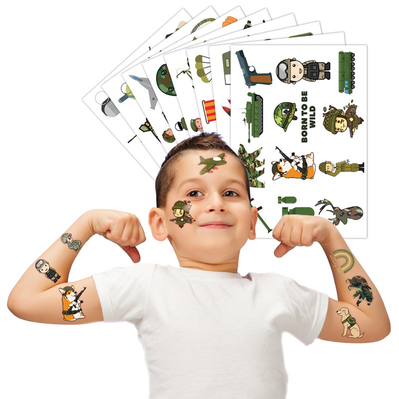 - 🎁【GREAT GIFT IDEAS FOR CAMO ARMY PARTY FAVORS SUPPLIES】: Camo temporary tattoos supply children with the experience of dangerous military attacks. From that given the camo tattoos of our shop, children will play the role of the real warrior in a virtual fighting scene arranged with gun, bullet and military equipment. During the moments of party, children have no boredom at all replaced with the cheer plus excitement when they play with our tattoos.