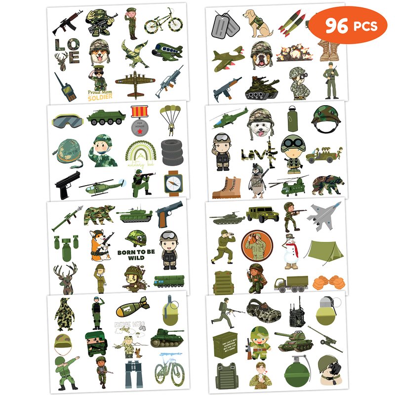 - 🎖️【PERFECT TATTOOS FOR THEMED CAMO PARTY DECORATIONS】: CAMO tattoos stickers retaining to our popular collection will meet the requirements that children all over the world need at Birthday parties, Christmas, and special celebrations. Each tattoos set covers 8 sheets in total with 96 Pcs. The size of each Camo sheet is 6.1 * 3.1 inches, one size fit for adults to kids. The numerous formed Camo tattoos sticker designed to vibrant color will promise to develop the cute beauty for parties.