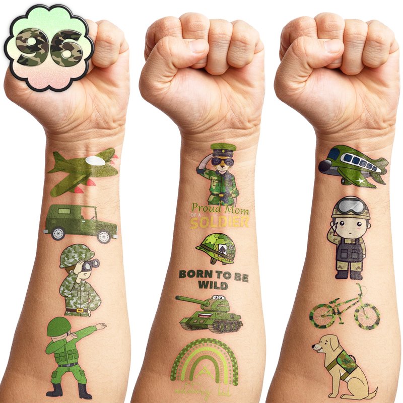 🎖️【PERFECT TATTOOS FOR THEMED CAMO PARTY DECORATIONS】: CAMO tattoos stickers retaining to our popular collection will meet the requirements that children all over the world need at Birthday parties, Christmas, and special celebrations. Each tattoos set covers 8 sheets in total with 96 Pcs. The size of each Camo sheet is 6.1 * 3.1 inches, one size fit for adults to kids. The numerous formed Camo tattoos sticker designed to vibrant color will promise to develop the cute beauty for parties. 🎁【GREAT GIFT IDEAS FOR CAMO ARMY PARTY FAVORS SUPPLIES】: Camo temporary tattoos supply children with the experience of dangerous military attacks. From that given the camo tattoos of our shop, children will play the role of the real warrior in a virtual fighting scene arranged with gun, bullet and military equipment. During the moments of party, children have no boredom at all replaced with the cheer plus excitement when they play with our tattoos. 🥳【ADD A TOUCH OF FUN】: Are you tired of mundane gifts? We've got you covered! Our collection of adorable and vibrant temporary tattoo designs can be applied to laptops, backpacks, desks, suitcases, books, water cups, and more. These playful elements will surely elevate your visual experience and bring a touch of joy to everyday items. 🌍【SAFE AND ENVIRONMENTALLY CONSCIOUS】: Our temporary tattoos are made from materials that are safe and prioritize sustainability. These tattoos are created using paper that is both safe for users and friendly to the environment. 🌴【EASY TO USE AND REMOVE】: Cut each tattoo out of sheets and remove the sheet clearly. You can stick it on hands, face, arms or wherever you feel safe. Moreover, you put it down on glasses, clothes, and a smooth flat . After that, you wet it thoroughly with water and wait for 20-30 seconds, you get rid of the backing paper. As a result, you have a velvety tattoo as we say.