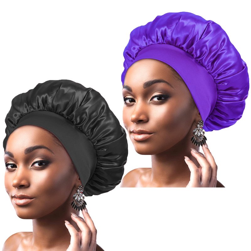 CAMOT 2Pcs Satin Bonnets for Sleeping, Silk Hair Bonnet for Women, Soft Silk Hair Wrap with Elastic Wide Band, Satin Sleep Cap for Curly Hair(Black+Purple)