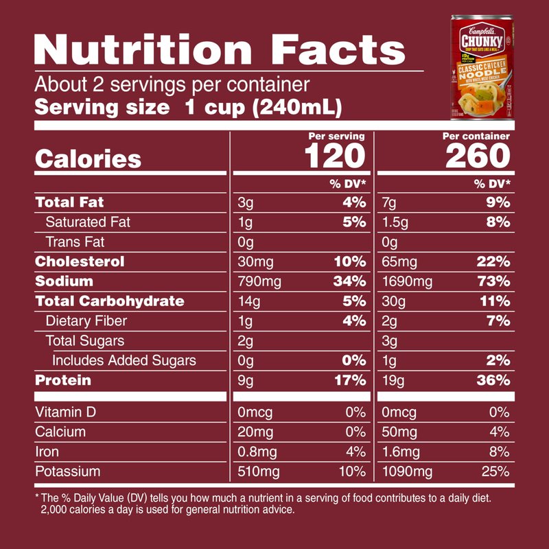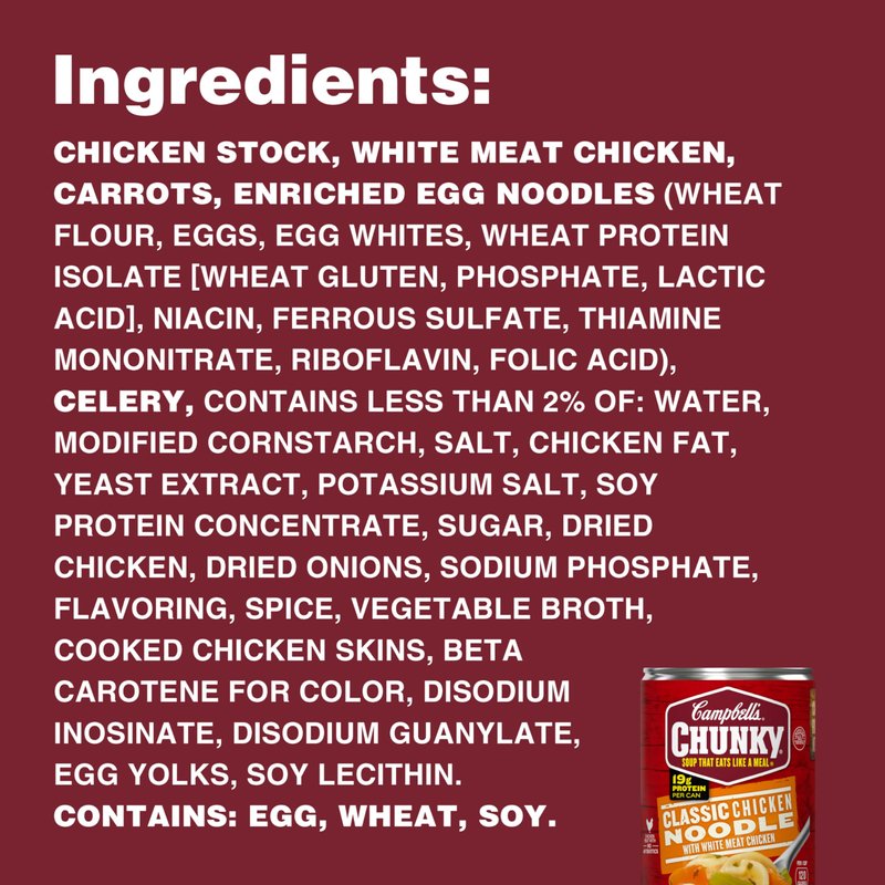 - Campbell's Chunky Soup: One (1) 18.6 oz can of Campbell’s Chunky Classic Chicken Noodle Soup