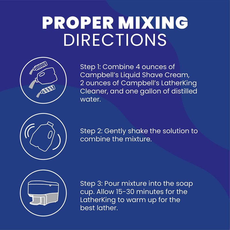 - LATHERKING USE DIRECTIONS: Mix 4 ounces (1/2 bottle) of Campbell’s Liquid Shave Cream and 2 ounces (1/4 bottle) of Campbell’s Latherking Cleaner with 1 gallon of distilled water. Shake the solution before filling the Latherking soap cup. Do not overfill.