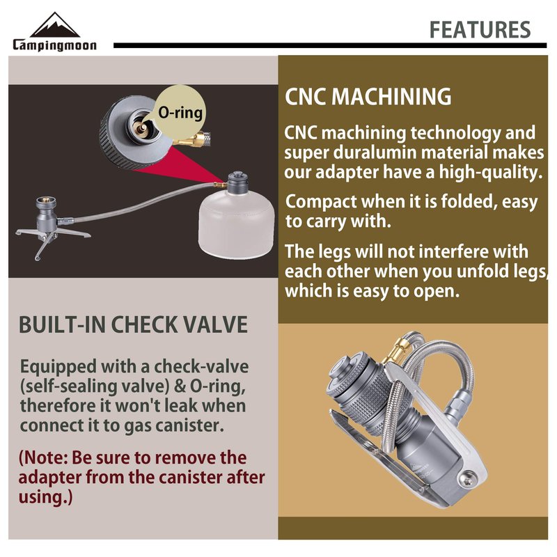 - BUILT-IN SELF-SEALING VALVE : Equipped with a check-valve (self-sealing valve) & O-ring, therefore it won't leak when connect it to gas canister.