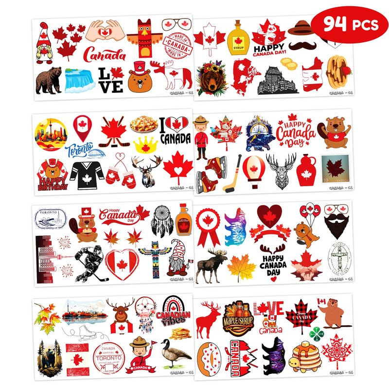 - 🍁 [PERFECT TATTOOS FOR THEMED CANADA ]: Canada Temporary Tattoos stickers include 8 sheets in total. With 8 sheets featuring a total of 85 exquisite and charming designs, our collection is a must-have for maple leaf enthusiasts of all ages. Each sheet measures 6.1 * 3.1 inches, allowing both kids and adults to proudly display their love for Canada on clothing, accessories, or as a thoughtful gift for fellow Canadian lovers. From a delicious maple syrup drizzle to the iconic Canadian flag.