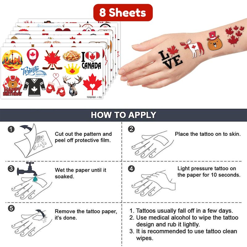 - 🌟【EASY TO USE AND REMOVE】: Applying these Canada-themed tattoos is a breeze. Simply cut out your desired design, peel off the clear backing, and place it on your skin or any other surface. Wet the tattoo thoroughly with water, wait for 20-30 seconds, and then gently remove the backing paper. Voila! You're left with a velvety, long-lasting tattoo that adds an enchanting touch to your celebrations.