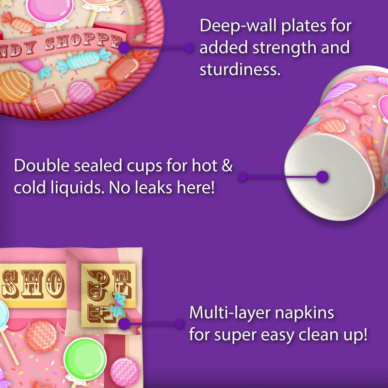 - PREMIUM DESIGN - Our Candy Themed Party Supplies are suitable for girl’s and boy’s birthday parties, holiday celebrations with your family and friends, special events or for just fun-filled daily meals, snacks, and desserts with picnics and cookouts. Shrieks of joy will be your reward when you use these fun and unique party tableware sets.