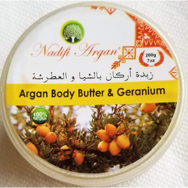 Known for its youth-preserving benefits and powerful simplicity, 100% Pure Moroccan Argan body butter and Geranium is nature's anti-aging, skin-smoothing superfood for the skin. Like a nourishing shield that protects skin from skin-aging free radicals and environmental damage, this 100 percent organic gold is clinically proven to visibly improve skin smoothness and hydration, reduces the harshness caused by eczema and other skin irritations. It absorbs easily into skin and is full of essential fatty acids, vitamin E, and antioxidants for unrivaled nourishing and healing benefits to create a balanced, youthful-looking complexion that glows with health. Especially great for sensitive and dry skin, this do-it-all essential can be used on all skin type and helps keep you looking and feeling beautiful from head-to-toe.