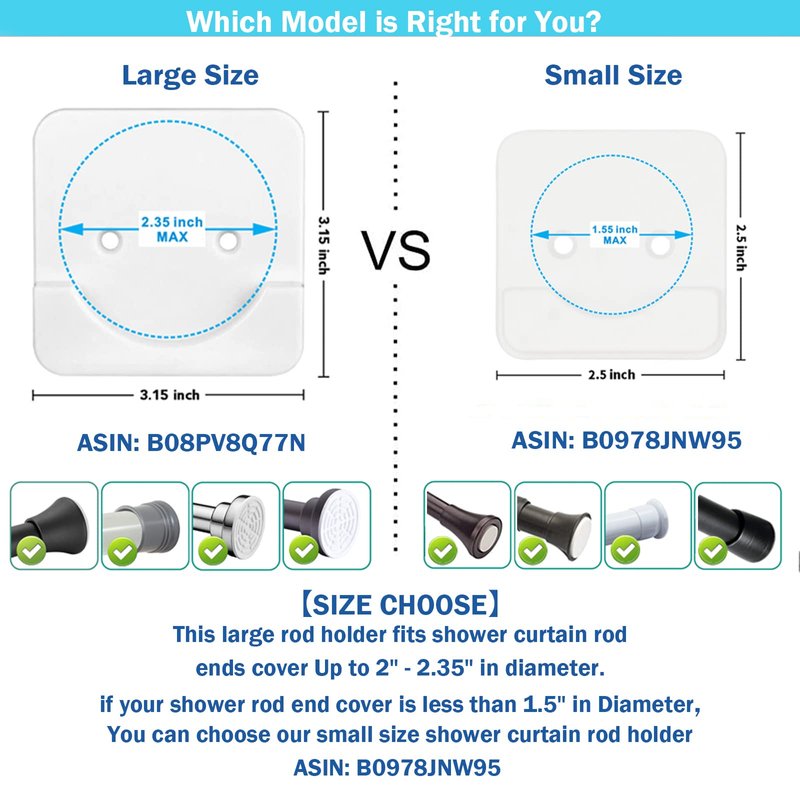 - 【SIZE CHOOSE】This Extra-Large shower rod holder Fits Shower Curtain Rod Ends Cover Up to 2" - 2.35" in Diameter. You can choose our small size shower curtain rod holder ASIN: B0978JNW95, if your shower rod end cover is less than 1.5" in Diameter.