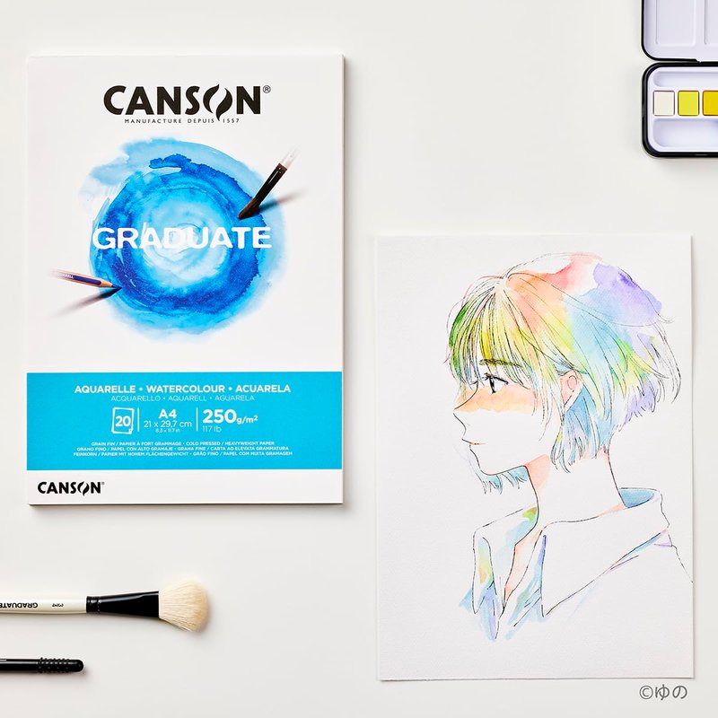 CANSON Graduate Watercolour 250gsm A4 Paper, Cold Pressed, Pad Glued Short Side, 20 Natural White Sheets, Ideal for Student Artists