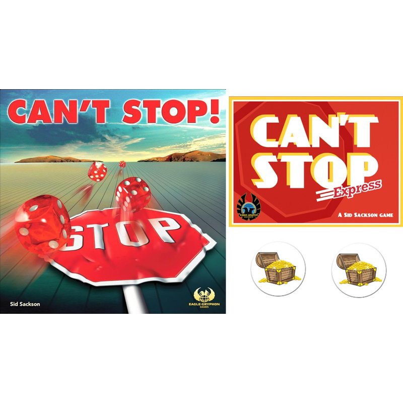 Bundle contains the Can't Stop board game and the Can't Stop Express travel game.Cant’ Stop is a press your luck game. Roll the 4 dice to make 2 pairs. Advance your markers up the number columns according to your rolls. Be the first to make it to the top of 3 columns and you win! Players can keep rolling dice as long as they can advance a marker. If they can’t, they lose all of their progress made on that turn! Everyone likes to keep rolling again and again. They can’t stop! Can you? Can't Stop Express is an addictive and easy to learn dice game designed by Sid Sackson. To be successful you will need the courage to take risks, but also the ability to strategize and plan ahead. After each roll of the five dice, you must choose the best combination of two pairs in order to score the most points. The 5th die acts as a timer that will indicate the end of the game. The player with the most points at the end of the game is the winner! Two bonus Treasure Chest pin back buttons