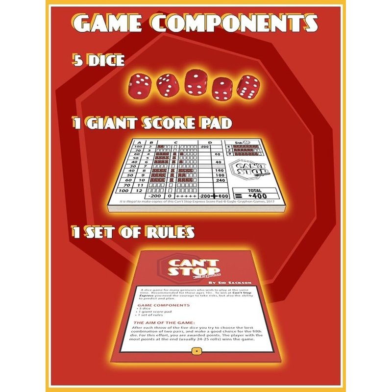 - Can't Stop Express is an addictive and easy to learn dice game designed by Sid Sackson. To be successful you will need the courage to take risks, but also the ability to strategize and plan ahead. After each roll of the five dice, you must choose the best combination of two pairs in order to score the most points. The 5th die acts as a timer that will indicate the end of the game. The player with the most points at the end of the game is the winner!