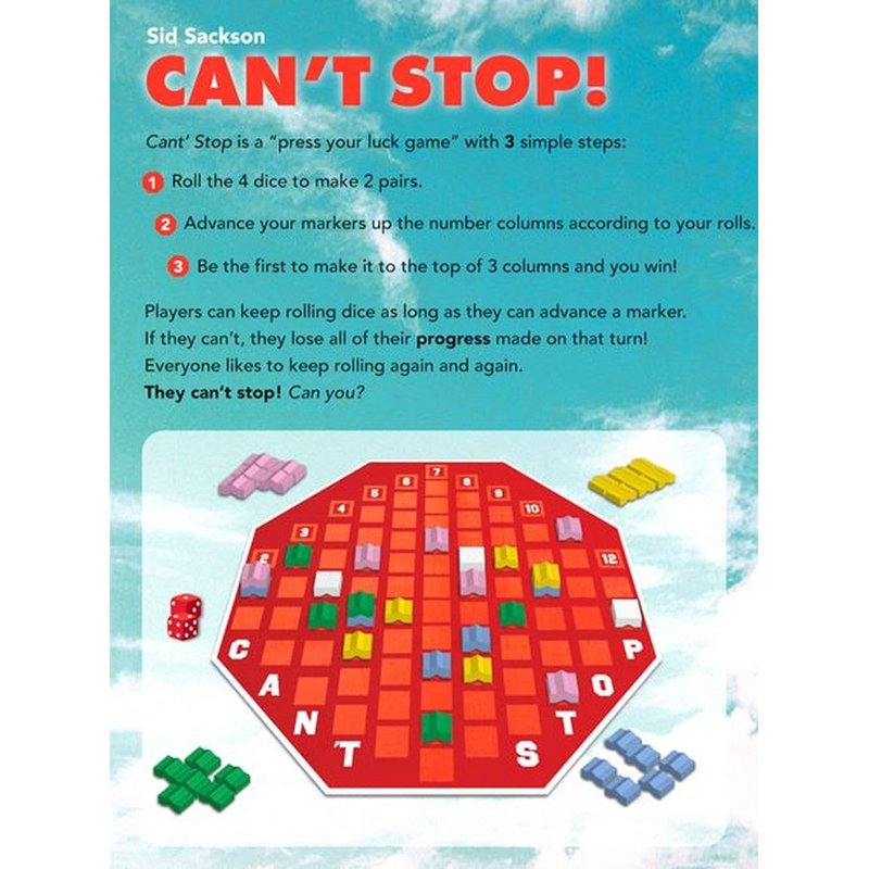 - Can't Stop is a press your luck game. Roll the 4 dice to make 2 pairs. Advance your markers up the number columns according to your rolls. Be the first to make it to the top of 3 columns and you win! Players can keep rolling dice as long as they can advance a marker. If they can’t, they lose all of their progress made on that turn! Everyone likes to keep rolling again and again. They can’t stop! Can you?