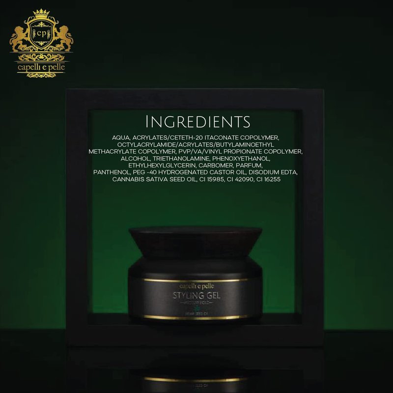 WHY βcapelli e pelleβ STYLING GEL Itβs a premium luxury stylish hair gel that does it all for your hair. When youβre looking for a product that will give you smooth, thick, shiny hair without leaving it greasy or sticky our Hair Styling Gel is the perfect solution. Very little gel is needed, you can add more if you desire to get that more defined look. WHAT IS MEDIUM HOLD HAIR GEL? Medium hold means that your hair will stay in place. There's slightly less shine to this formula, so it's ideal for a natural look like there's no product in your hair at all. BENEFITS Helps in styling your hair for all kinds of hairstyles. Helps to define curls. Safe and can be used every day. Your hair and keeps it feeling soft all day long. Excellent as Men & Women Styling Gel as well. HOW DO YOU USE Take a small amount of styling gel in your palm and spread it over your hands evenly. Apply it over your hair evenly. Style your hair the way you want. HAIR CARE Whether itβs a modern, casual, formal, classic, slick, or messy hairdo you want, this stylish hair gel will help you attain the exact style youβre looking for. Plus, it rinses out easily when youβre through. No muss, no fuss.