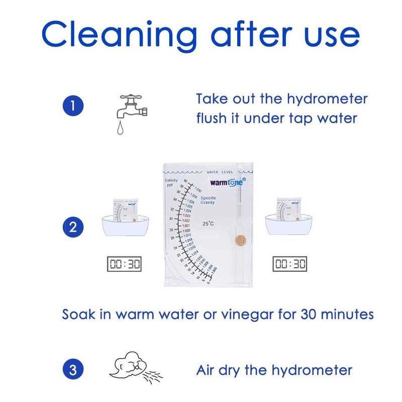 4.When any salt is on the pointer, the salinity hydrometer will not read correctly. After use the hydrometer, it should be cleaned with tap water,then Soak in warm water or vinegar for 30 minutes, then air dry in cool place.