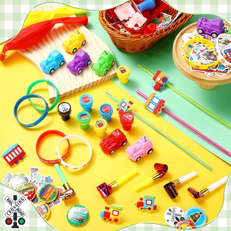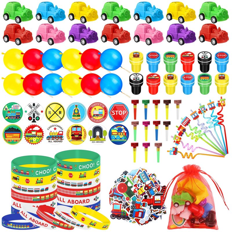 - Ideal Party Addition: these beautiful party favors train are fun and practical, and the ample train party favors include everything you need to throw an unforgettable train themed party; From train straws, Blower Noisemakers and organza bags to button pins, stamps and stickers, you'll find every party essential in one place