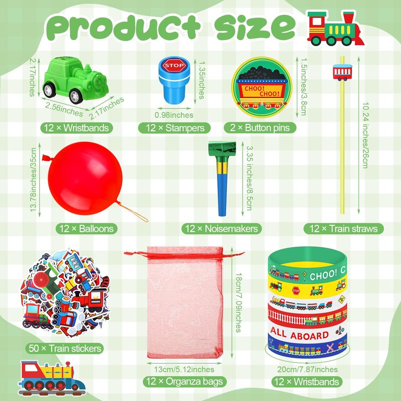 - Packing List: you will receive 146 train birthday party supplies, including 12 train bracelets, 12 stamps, 12 badges, 12 train cars, 12 straws, 12 balloons, 12 noisemakers, 12 organza bags and 50 train stickers; Plenty of quantity for an exciting party experience