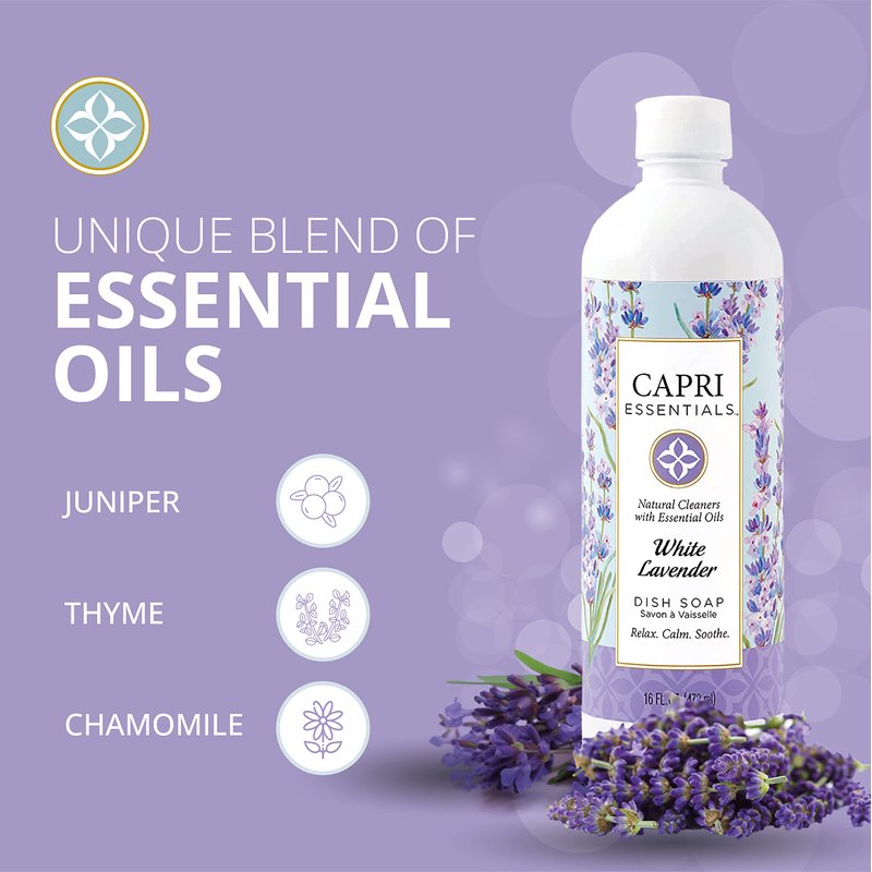 - Relax, Calm, Soothe: Capri’s White Lavender liquid dish soap contains an essential oil blend that keeps your dishes clean while helping to promote relaxation, reduce stress, and calm nerves. Due to their antioxidant properties, essential oils in our Lavender dish liquid soap are gentle on your skin.
