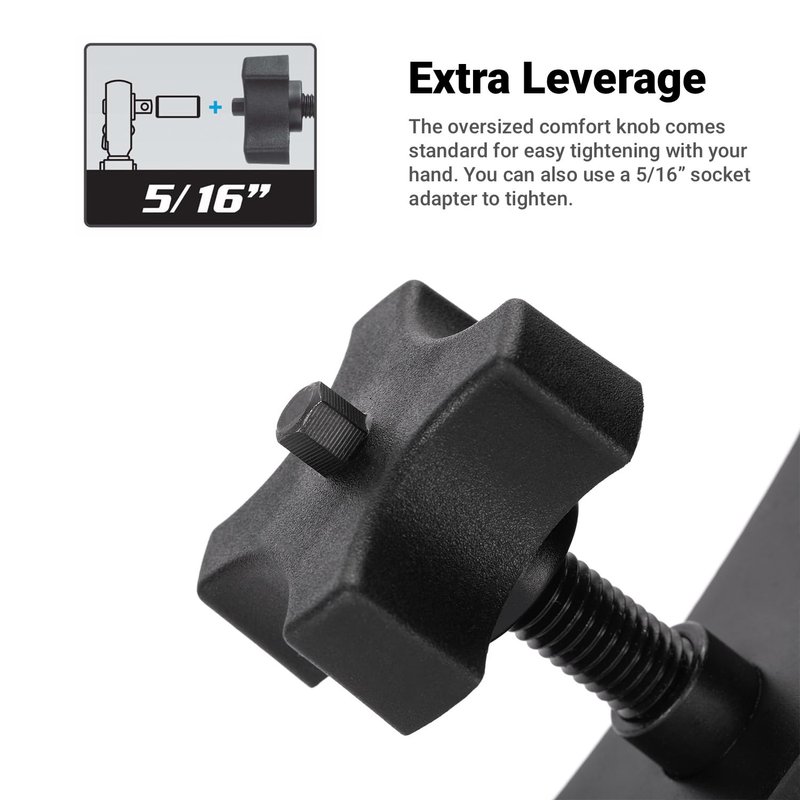 - Hand tighten with built-in comfort knob or use a socket wrench with a 5/16 inch socket adapter