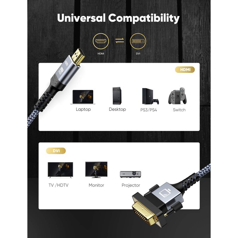 - HD 1080P PLUG-and-PLAY: Supports resolutions at 800x600, 1024x768, 1280x1024, 1600x1200, and 1080p for high-resolution LCD and LED monitors; The HDMI to DVI cable is the same as the DVI to HDMI cable, DVI to HDMI adapter, HDMI to DVI adapter