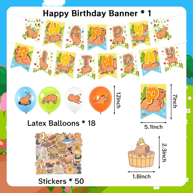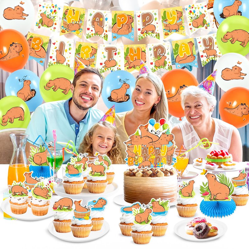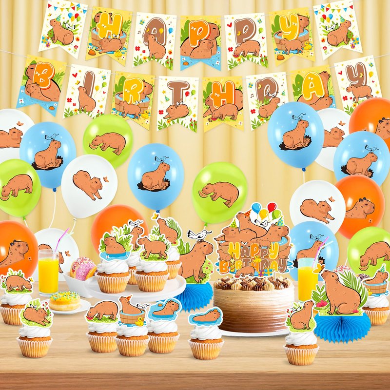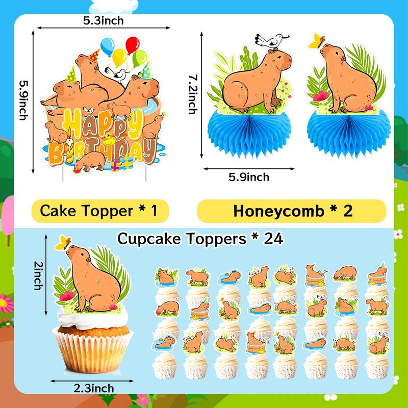 - Complete Capybara Party Set: Includes 1pc happy birthday banner, 2pcs honeycomb, 18pcs latex balloons, 50pcs stickers, 1pc cake topper, 24pcs cupcake toppers, everything you need for a fun and memorable party
