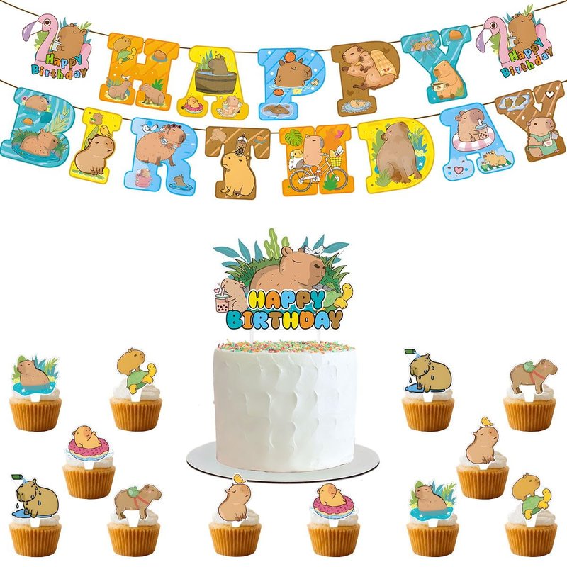 - 1. Capybara Party Decorations: Package includes 1* capybara birthday banner, 1*capybara Birthday cake topper, 12* capybara cupcake toppers, 16* capybara balloons,12*spiral