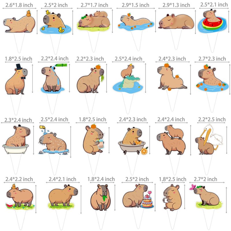 - Contain:You will receive 48pcs capybara cupcake toppers, each size of the capybara cake decoration is about 2.3×2.4 inches. 24 Different capybara styles and each pattern has 2pcs. Enough quality for your capybara animals party needs