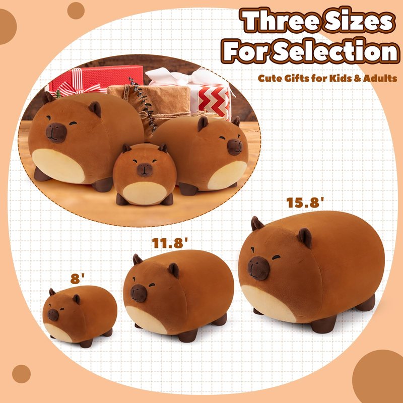 - 🎁【Perfect Gift】The kawaii cuddly Capybara stuffed measures 11.8", no one can refuse this a delightful present. Embracing this Capybara plushie helps melt away all bad moods and work stress! It can be used for kids' birthdays, Halloween, Christmas, Valentine's Day, Thanksgiving. It will bring good luck to your family and friends! Why not choose this cute Capybara plushies to express your concern for your girlfriend, child or friend. your friends, family, and loved ones will love it very much!