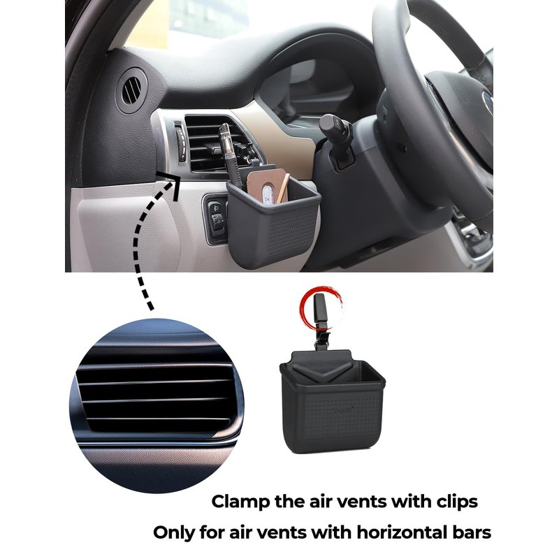 - Simple installation: Just hang on the car air outlet, save space and keeps car accessories and small things. The fixed hook is suitable for most of the car vent structure, and it will not fall off easily after this car organizer is installed.