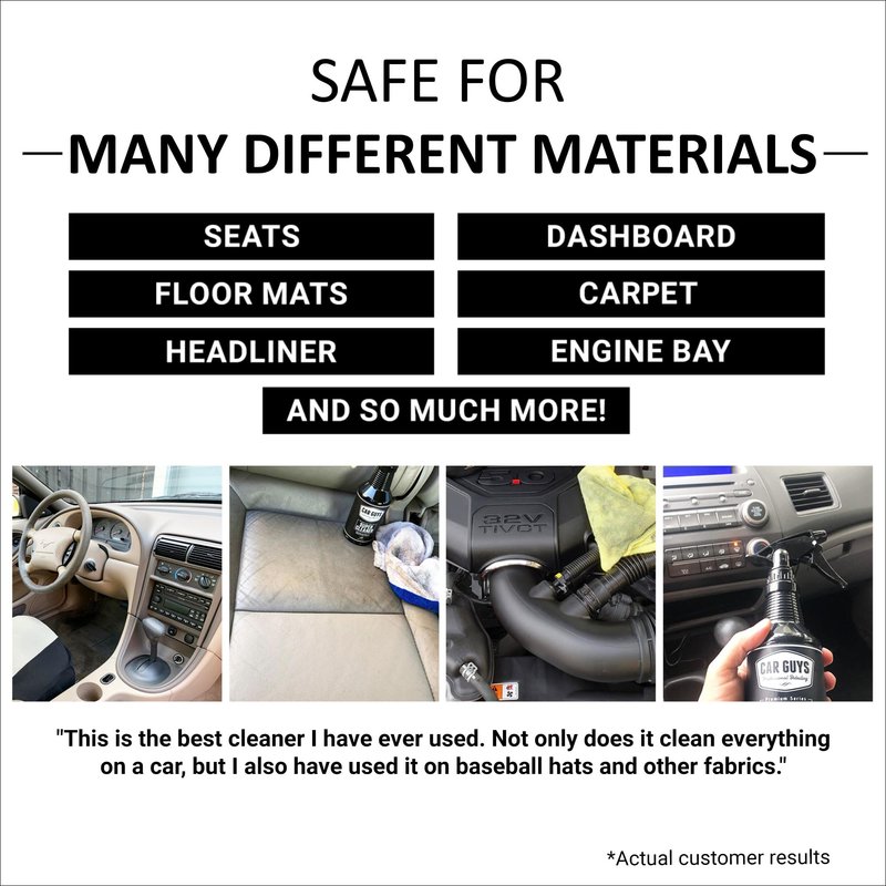 - REPLACE YOUR CABINET OF CHEMICALS! – Do you get confused by all the different types of cleaning supplies that are available? It gets frustrating fast! Just cleaning your vehicle requires some special deep stain remover, a chemical solvent to get rid of bug and tar, a separate floor mat and inner dash cleaner.. and the list goes on and on! Keep it simple with one multipurpose product, CarGuys Super Cleaner... the KING OF ALL CLEANERS !