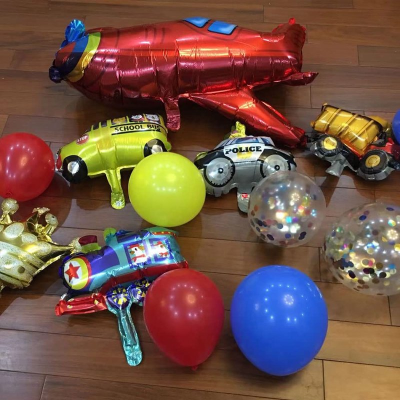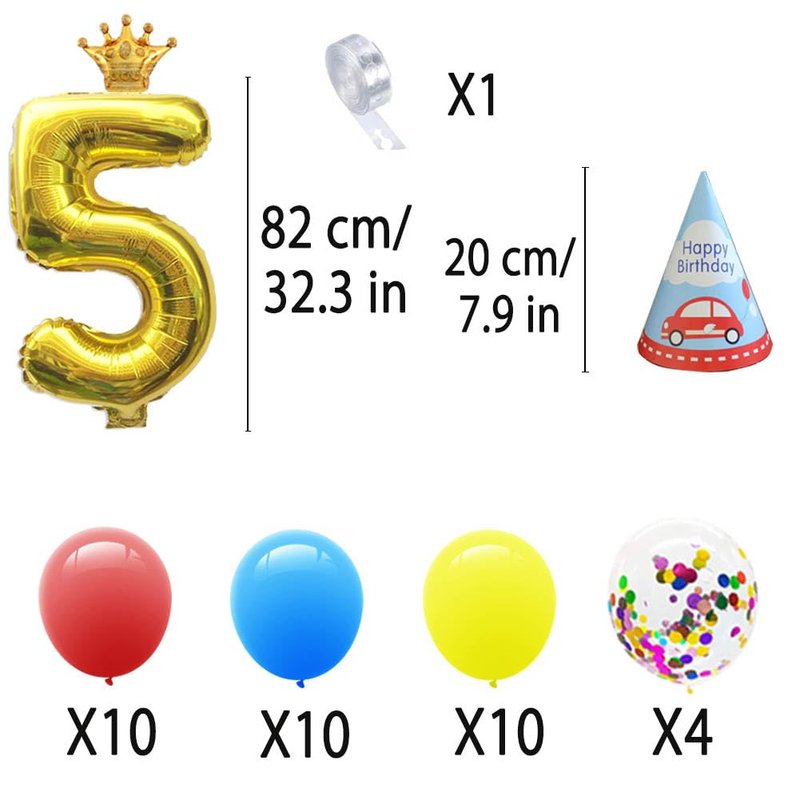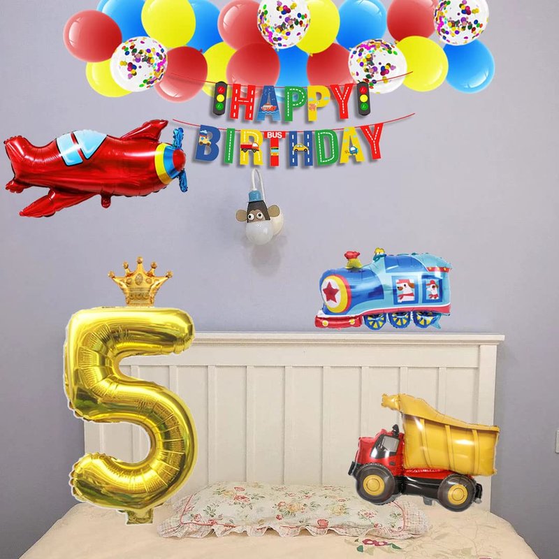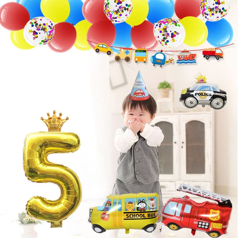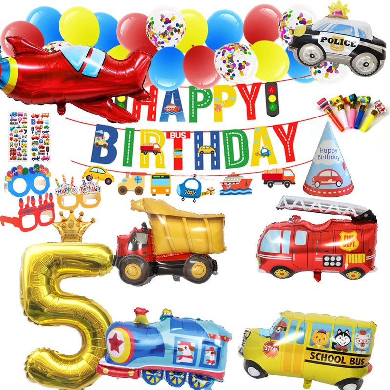 - [Party content] 1pcs traffic banner, 1pcs train foil balloon, 1pcs aircraft foil balloon, 1pcs police car foil balloon, 1pcs school bus foil balloon, 1pcs fire truck foil balloon, 1pcs engineering car foil balloon,1pcs 【5】 foil balloon,1pcs crown foil balloon,1pcs birthday hat,2pcs car stickers,3pcs birthday glasses,5pcs blowouts noisemakers and 6pcs latex balloon,30pcs Latex balloons,4pcs confetti balloon,1pcs Balloon chains.