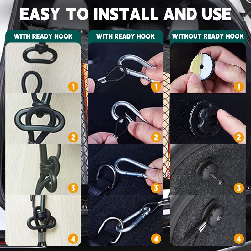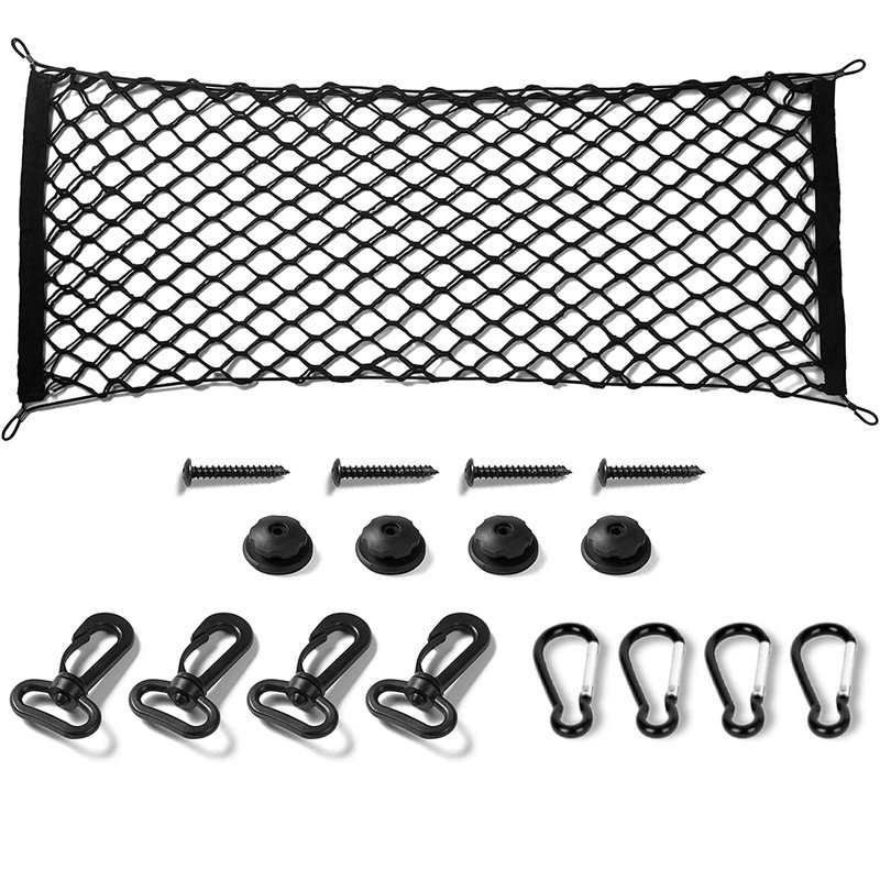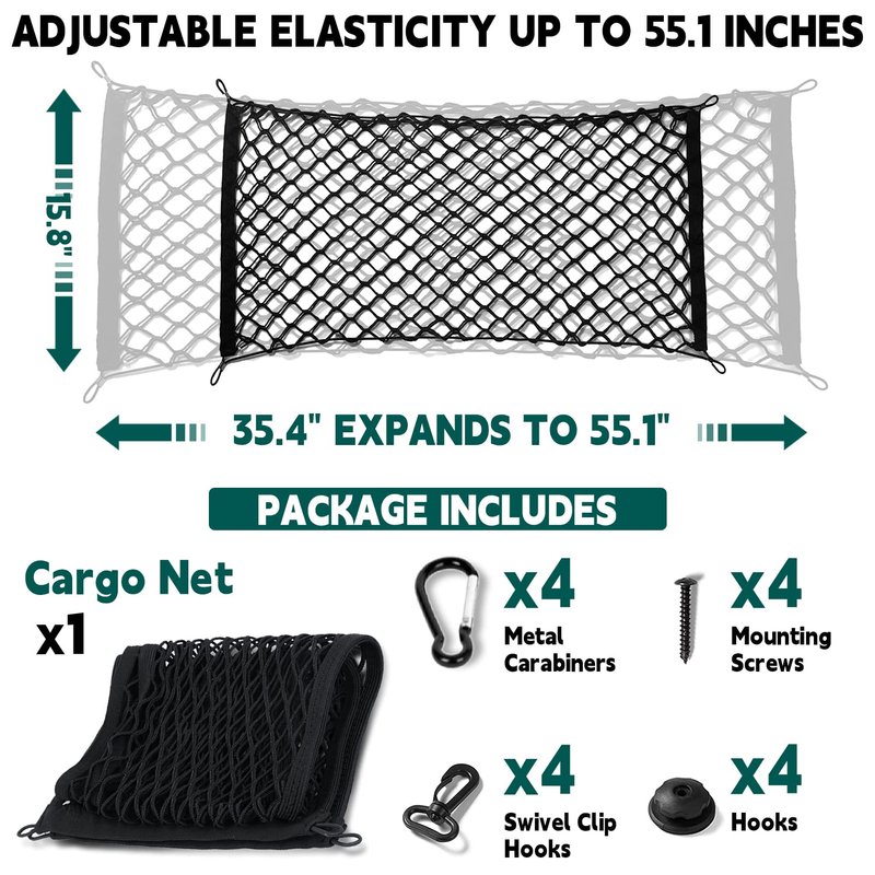 - 【LARGE CAPACITY NET CAR TRUNK】The car trunk cargo net has elasticity and stretchability, the maximum stretchable size is 55.1"×15.8", relaxed size is 35.4"×15.8". you can stretch it to the proper size according to your needs. Includes 1 cargo storage net, 4 hooks, 4 carabiners and 4 swivel clips, and 4 set parts. Note: Please confirm your car size before purchasing
