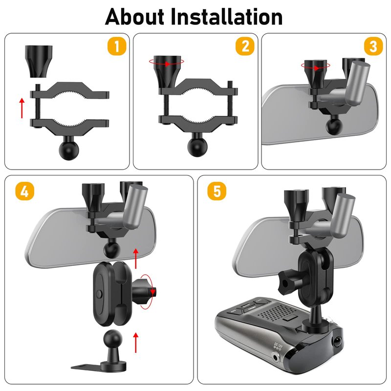 Radar detector rearview mirror installation kit, car/truck rearview mirror radar detector mount, safe and never falling off, 360 degree rotation, easy installation. Please Note that this mount will need 1 inch stem space to setup on to your rear view mirror.