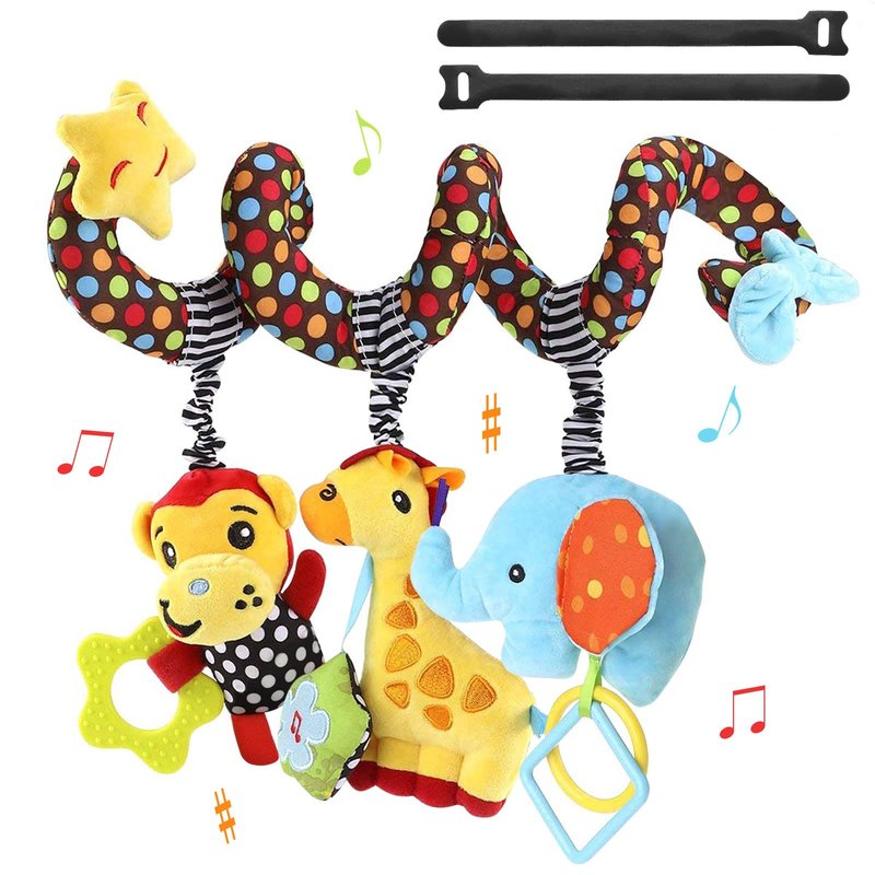 - 【Car Seat Toys for Babies 0-6 Months】The newborn toys has 3 cute animals, including a monkey with teether, a giraffe with music, and an elephant with rattle and rustle. The teether could soothe, massage, stimulate and clean baby's gums; The music will attract baby's attention and stimulate the development of hearing. The rattle and rustle are designed to increase baby boys and girls' curiosity and enrich cognitive world