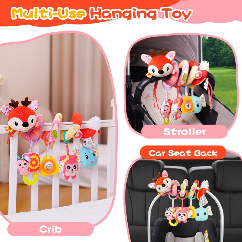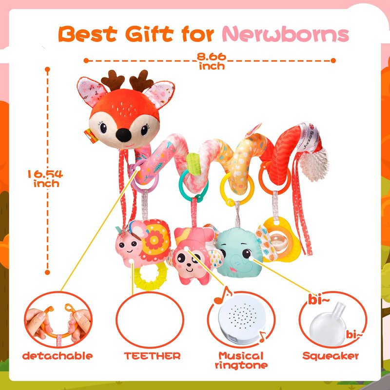- Stroller Toys for Baby's Development: Our baby car seat toy are designed with straps that are easy to attach to any car seat, stroller, baby stroller, stroller, etc. The spiral design around the baby's car seat provides full fun for baby on the go. Multi-purpose detachable hanging toys keep your baby fully entertained, the hanging parts with music box, crinkle sound paper and BB squeaker are perfect for interacting with babies, and the soft teether soothes their gums. They develop sight, hearing, touch and hand-eye coordination naturally as they play.