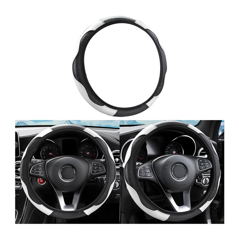 Car Steering Wheel Cover, Microfiber PU Leather Elastic Carbon Fiber Auto Steering Wheel Protector, 15 Inch Breathable Anti-Slip for Women Men, Car Interior Accessories for Most Cars (Black/White)